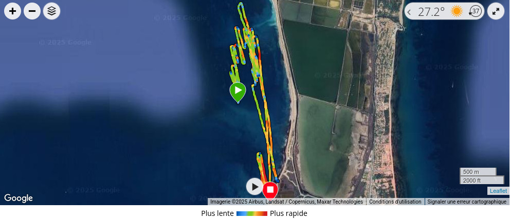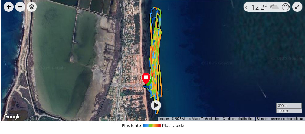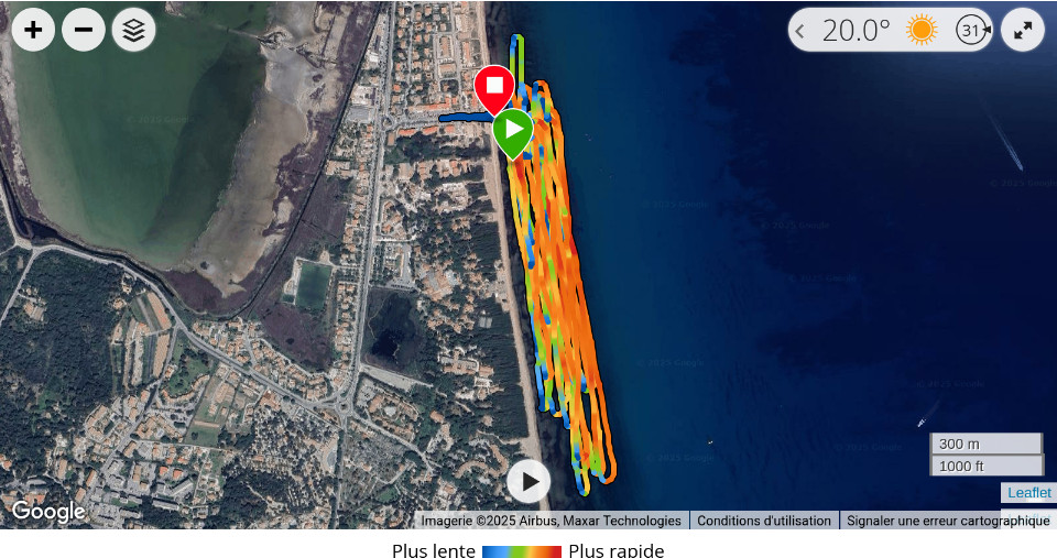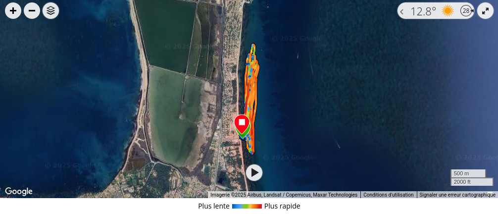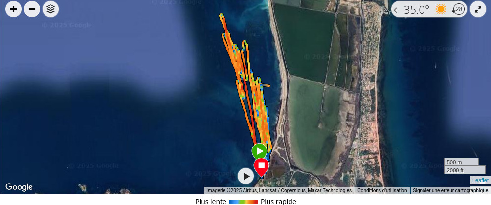 session plutôt cool sous le soleil de retour. La trace GPS, 40km de parcourus dans une session de 1h35 dont 1h26 en déplacement, vitesse max modeste de 21noeuds, 109bpm de moyenne, 160bpm max ![]() |
