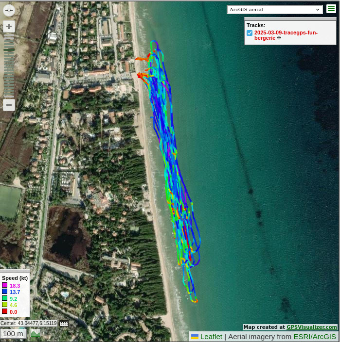 servi à rien. Je suis resté vers le passe pied où le plan d'eau était un poil plus clean avec quelques rares vagues. Ca reste une bonne session de reprise même si j'aurais préféré quand même un peu moins d'air. La trace GPS 21km parcourus lors d'une session de 1h10 dont 57min en mouvement, vitesse max de 18,3 nœuds, 125bpm de moyenne, 161 bpm max ![]() |