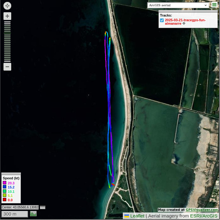 vagues étaient pas folichonnes. La trace GPS 30km parcourus lors d'une sortie de 1h13 dont 1h07 en déplacement donc avec très peu de pause, vitesse max de 20 nœuds. ![]() |