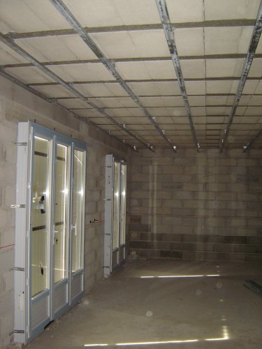 Le plaquiste a disposé les rails pour la fixation des plaques de placo. |